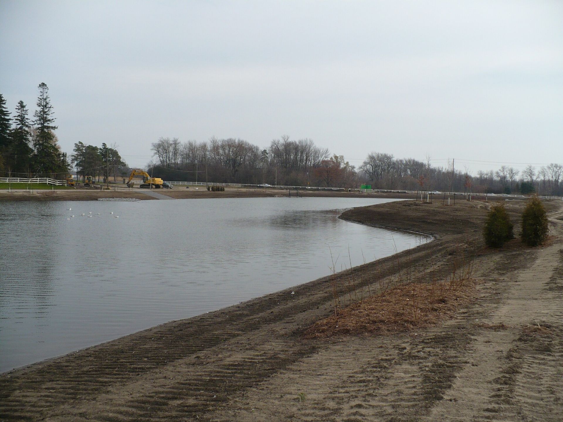 Shaping and leveling land for proper drainage and creating ponds for water management and aesthetic purposes.